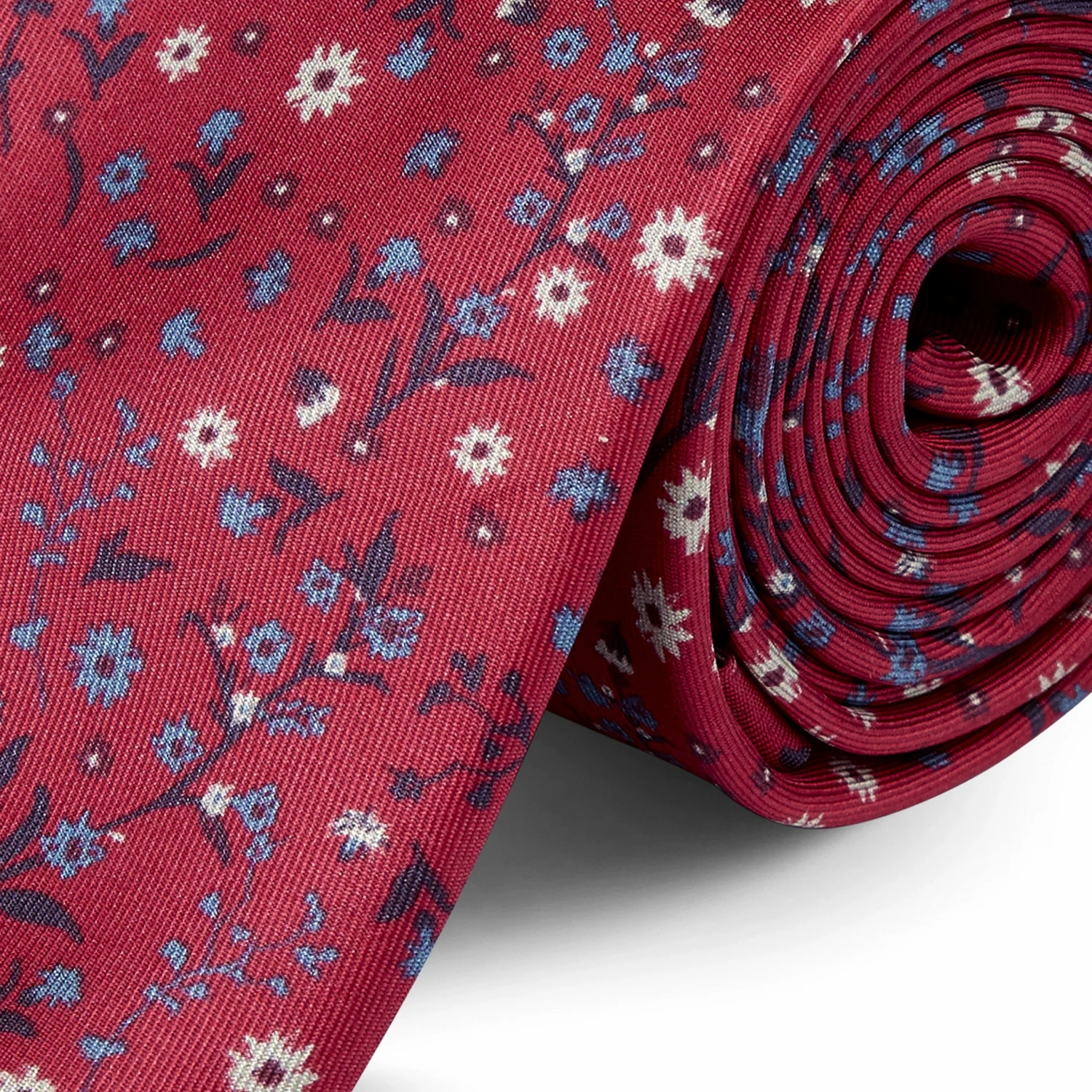Pale blue and cream flowers create an allover design that complements the subtle red silk. Makes for a fun take on the traditional red βpower tieβ. Comes in a gift box.