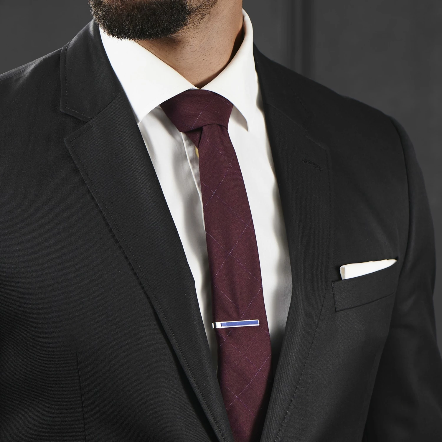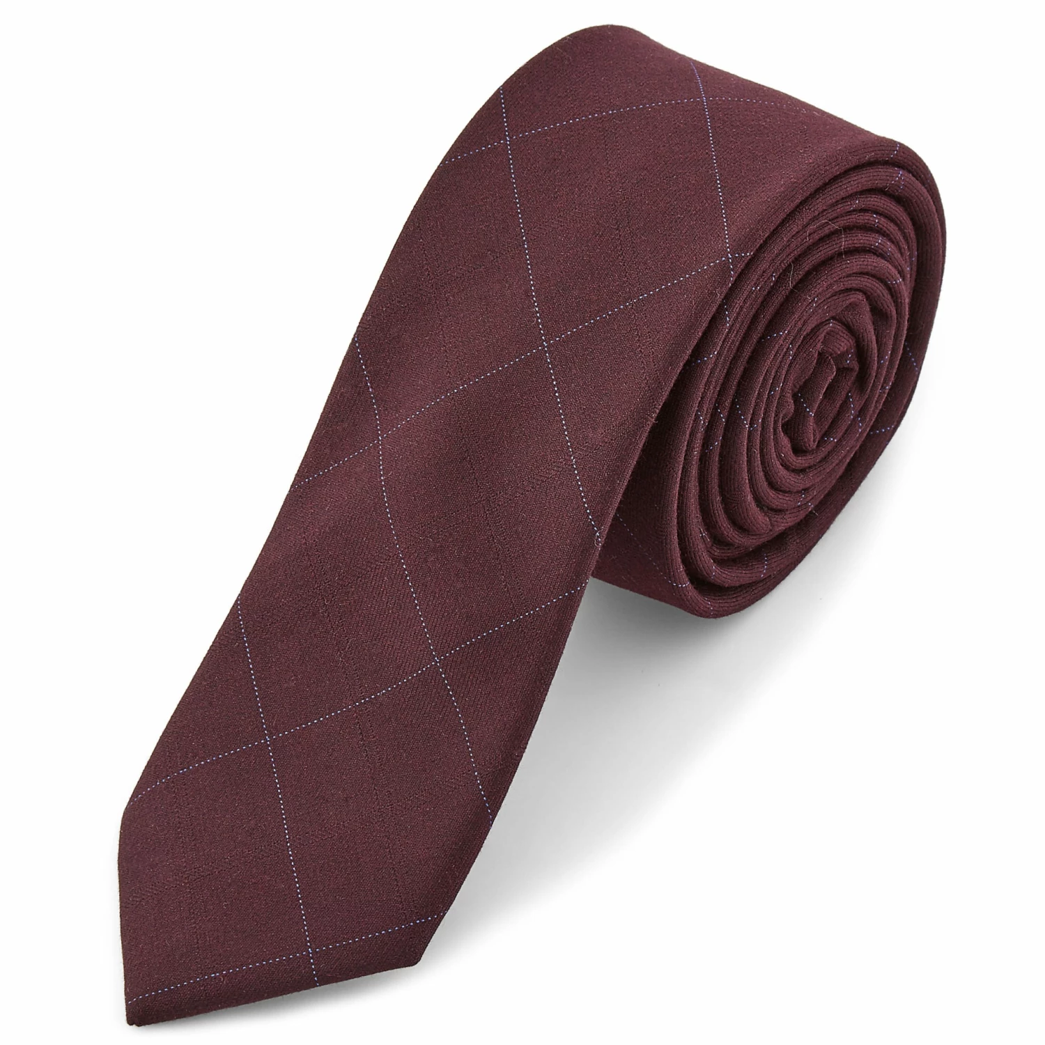 Truly a colorful combination, this burgundy cotton necktie benefits from a contrasting pale blue checkered design.