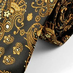 Features a vibrant gold paisley pattern on a black background. Add a pocket square for that extra touch of elegance and showcase your unique style. High-quality silk.