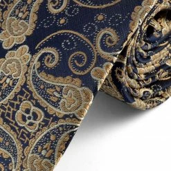 Our soft polyester neckwear features a detailed paisley pattern in creamy blue and gold. Wear it with your best suit or a more casual outfit for a uniquely stylish look. Semi-narrow model.