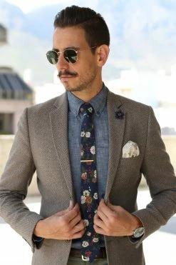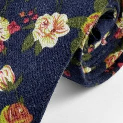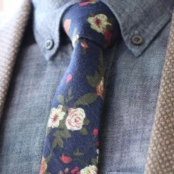 This tasteful dark blue tie has a white, pink and green floral pattern. Looks great with a classic suit and light-colored shirt, or any other combination you can think of. Don’t forget the pocket square and lapel flower!