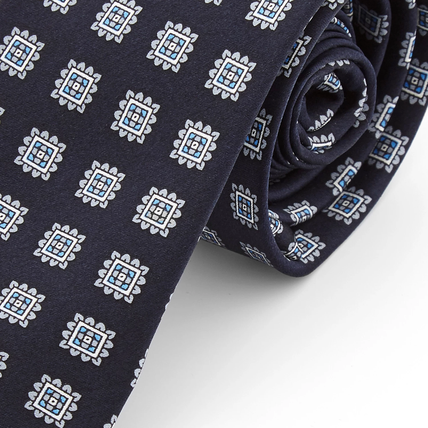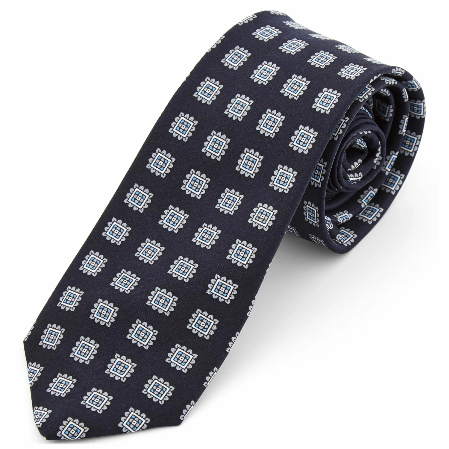 With its demure navy blue background and bold geometric pattern, this tie is a must-have for any man’s wardrobe. It’s elegant, slimming, and perfect for both casual and formal wear.