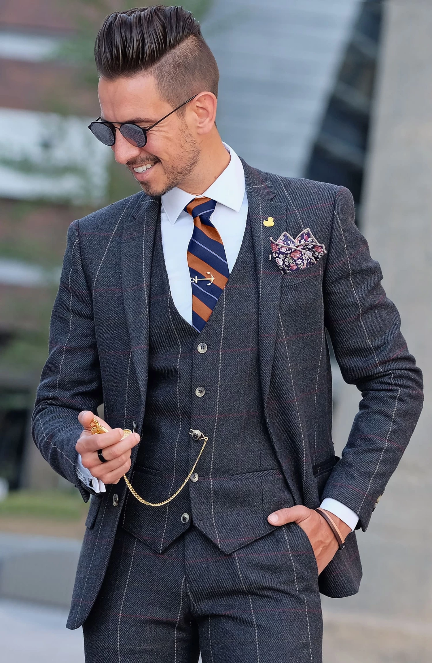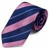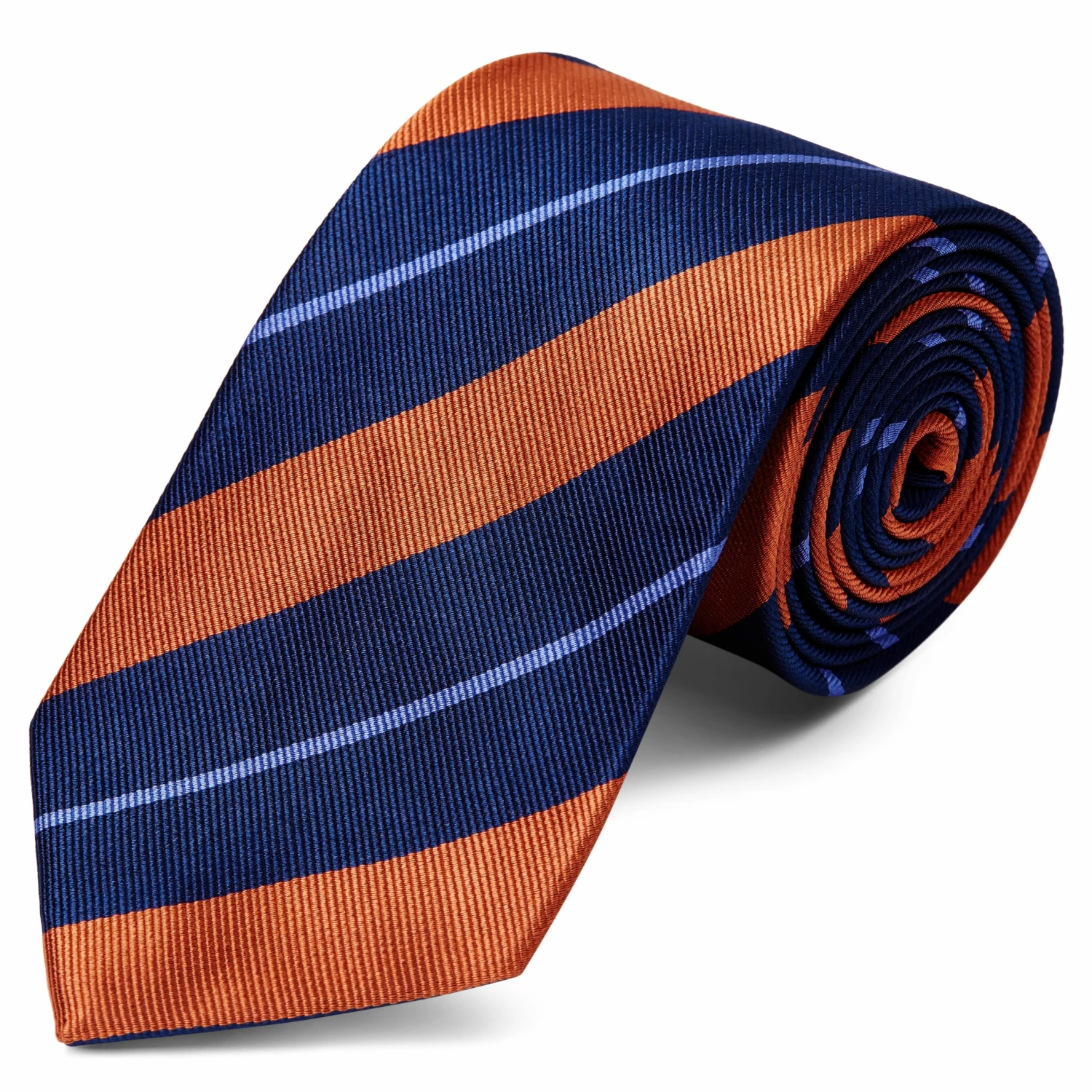 This necktie features bold orange stripes on gently contrasting pastel and navy blue for a distinctive finish to your tailored look.