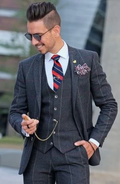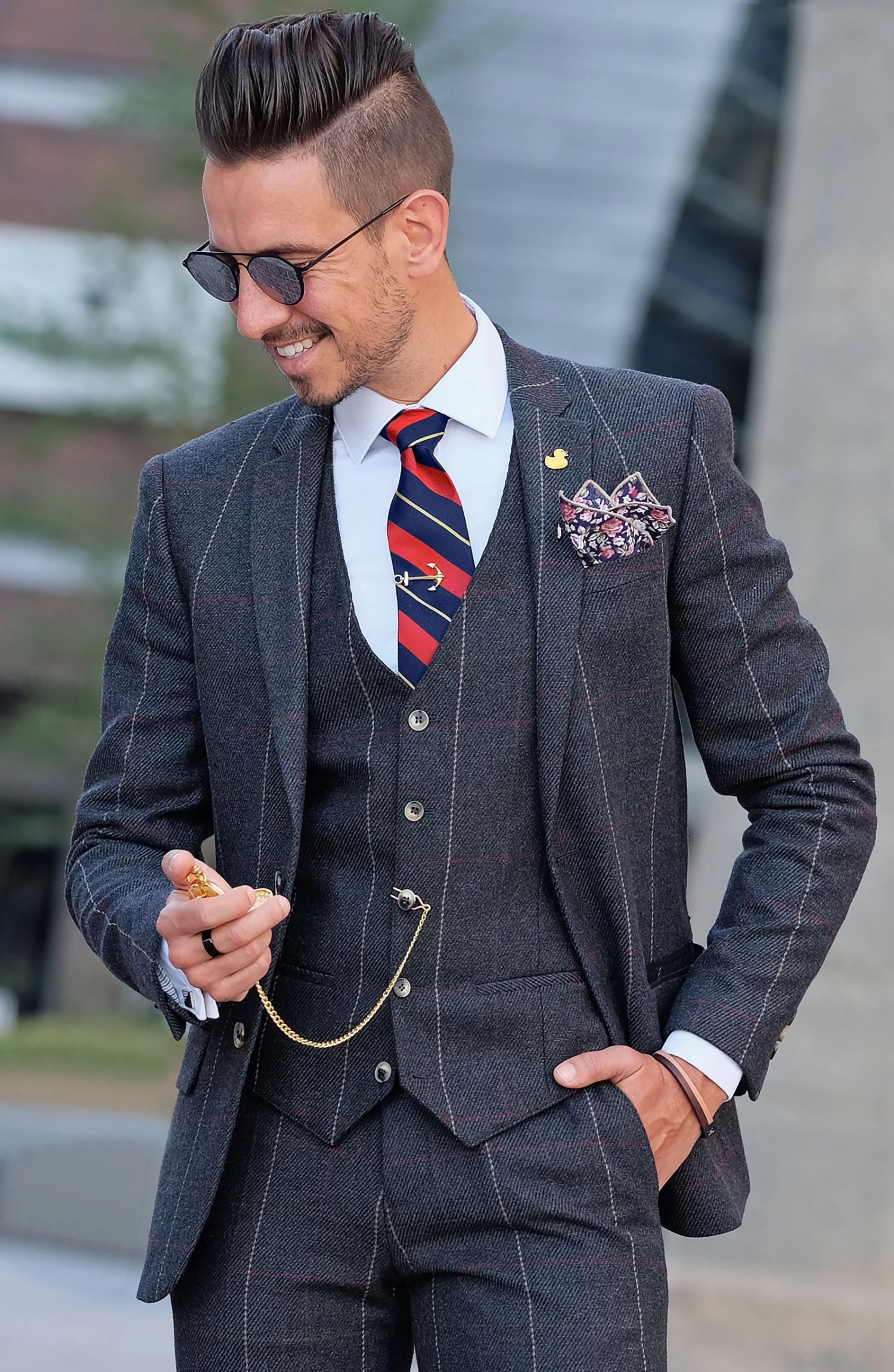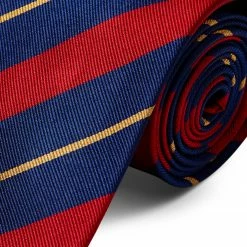 Rich red and gold stripes alternate on this dark navy necktie in a unique striped pattern, giving it a traditional feel.
