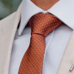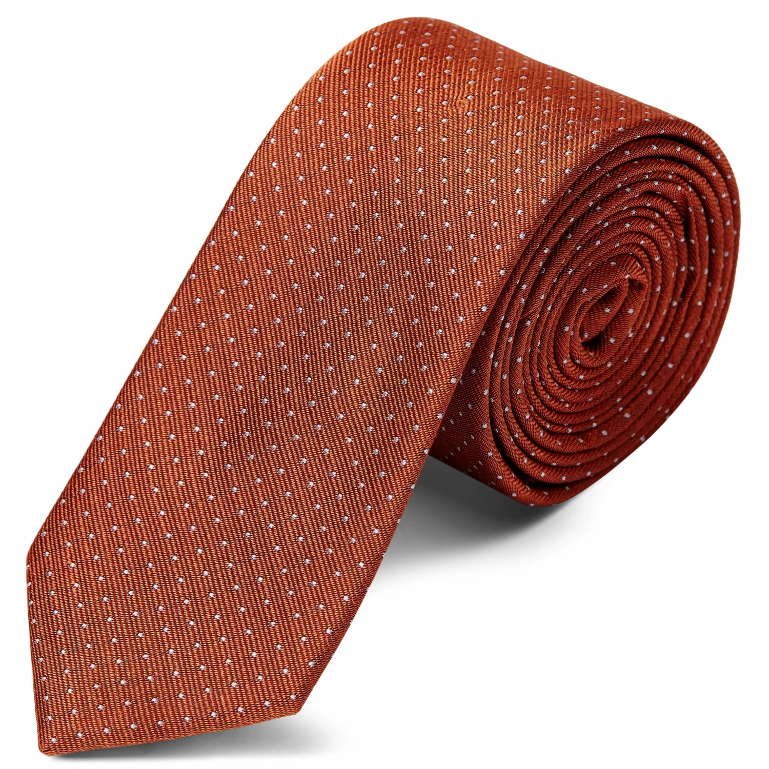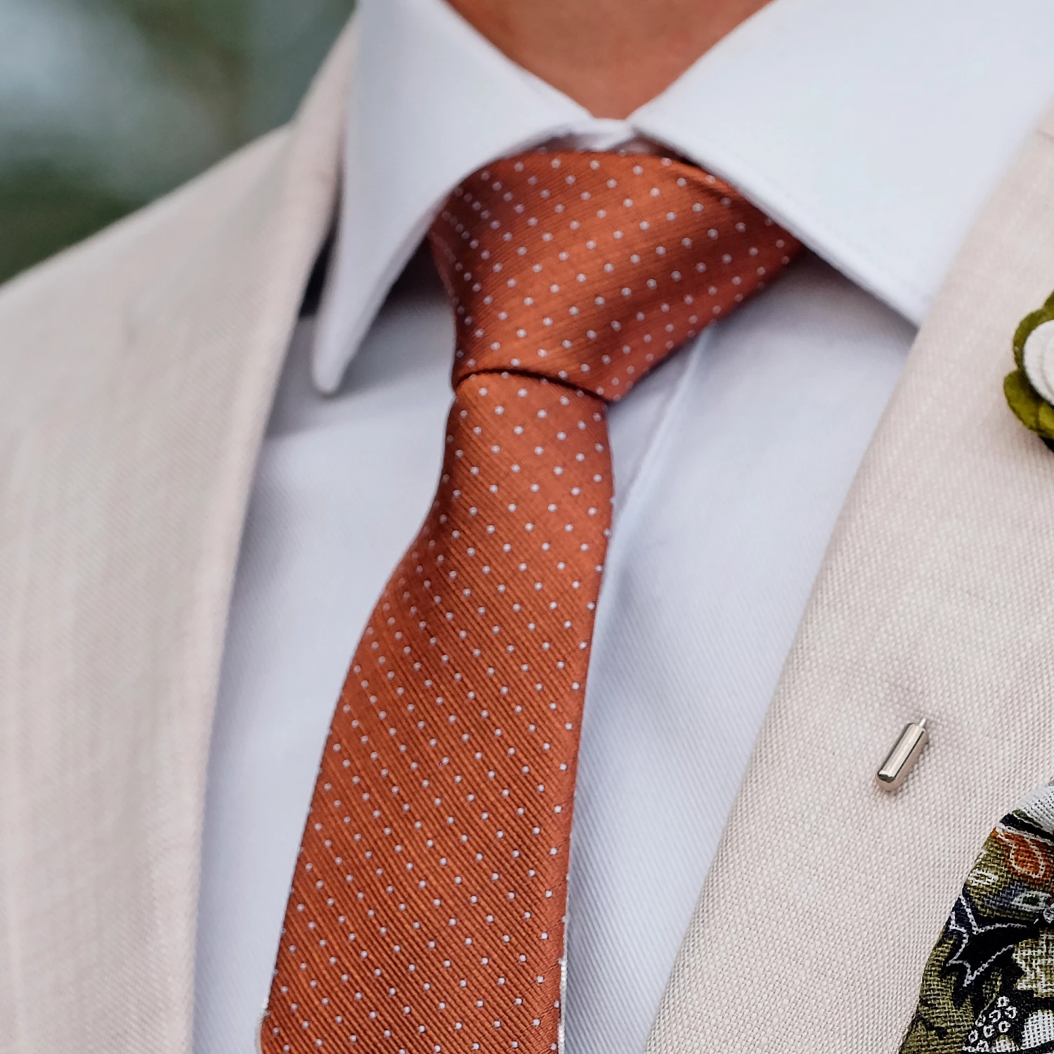 Finished in a beautiful burnished brown with finely contrasting white polka dots, this elegant necktie adds a touch of personality to your tailored look.