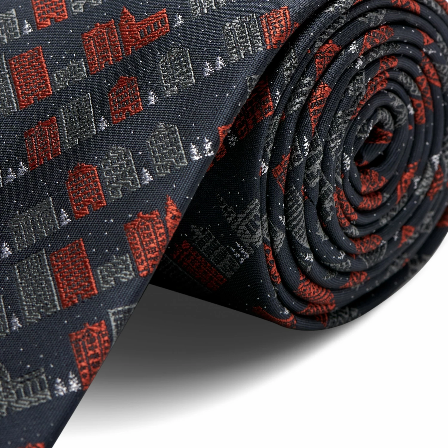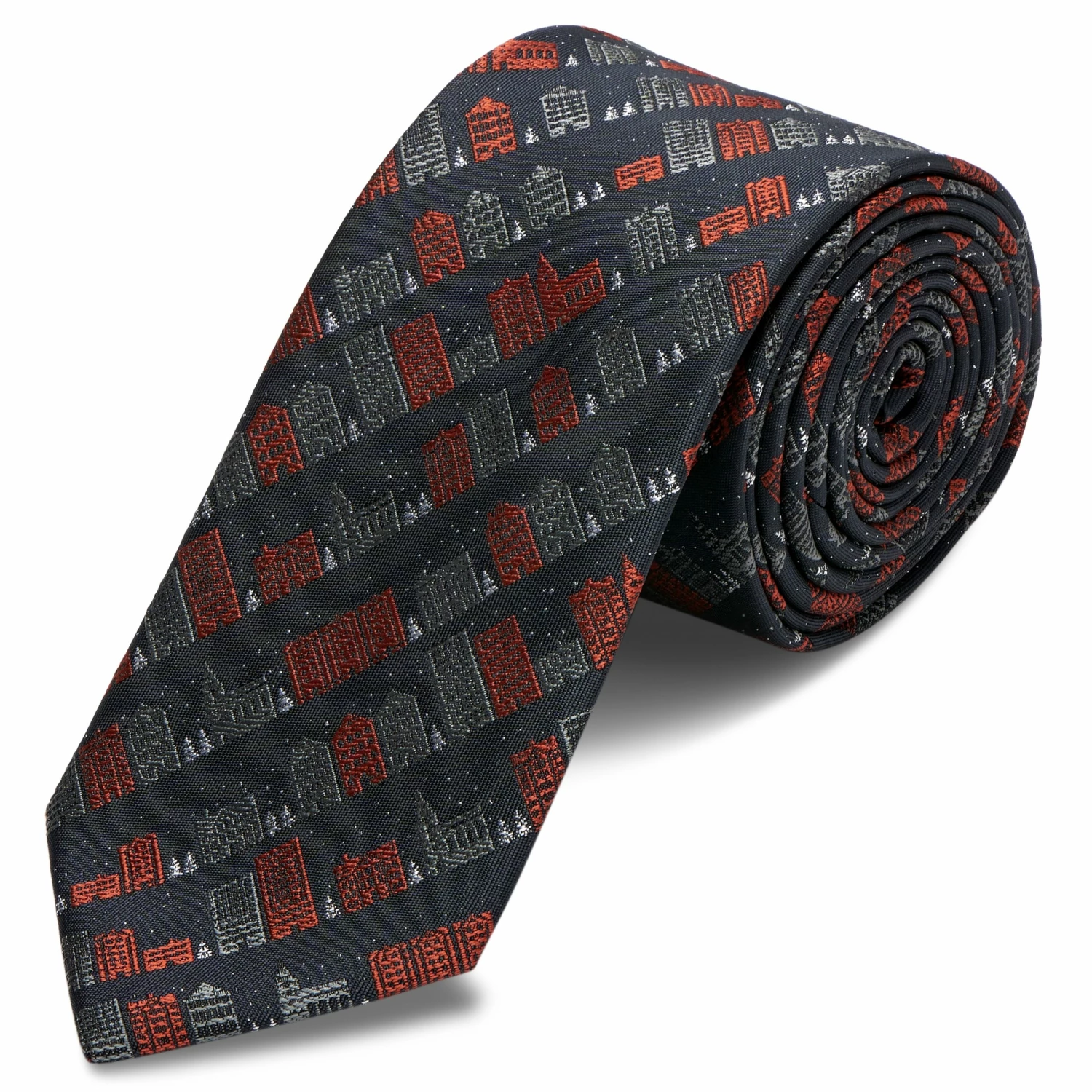 Hereβs a tie you can wear all winter longβ¦ even after Father Christmas has come and gone. Designed in a dark-grey, this lightweight polyester tie features a wintery cityscape complete with falling snow and tiny white trees.