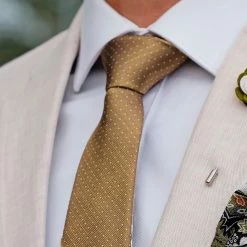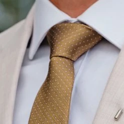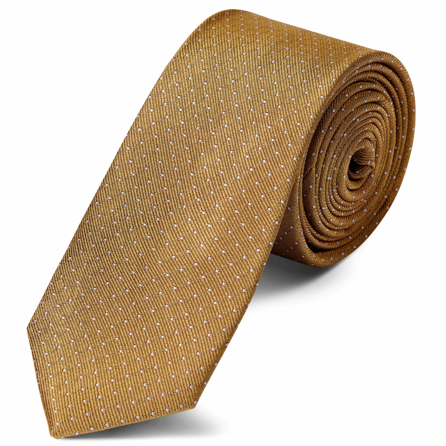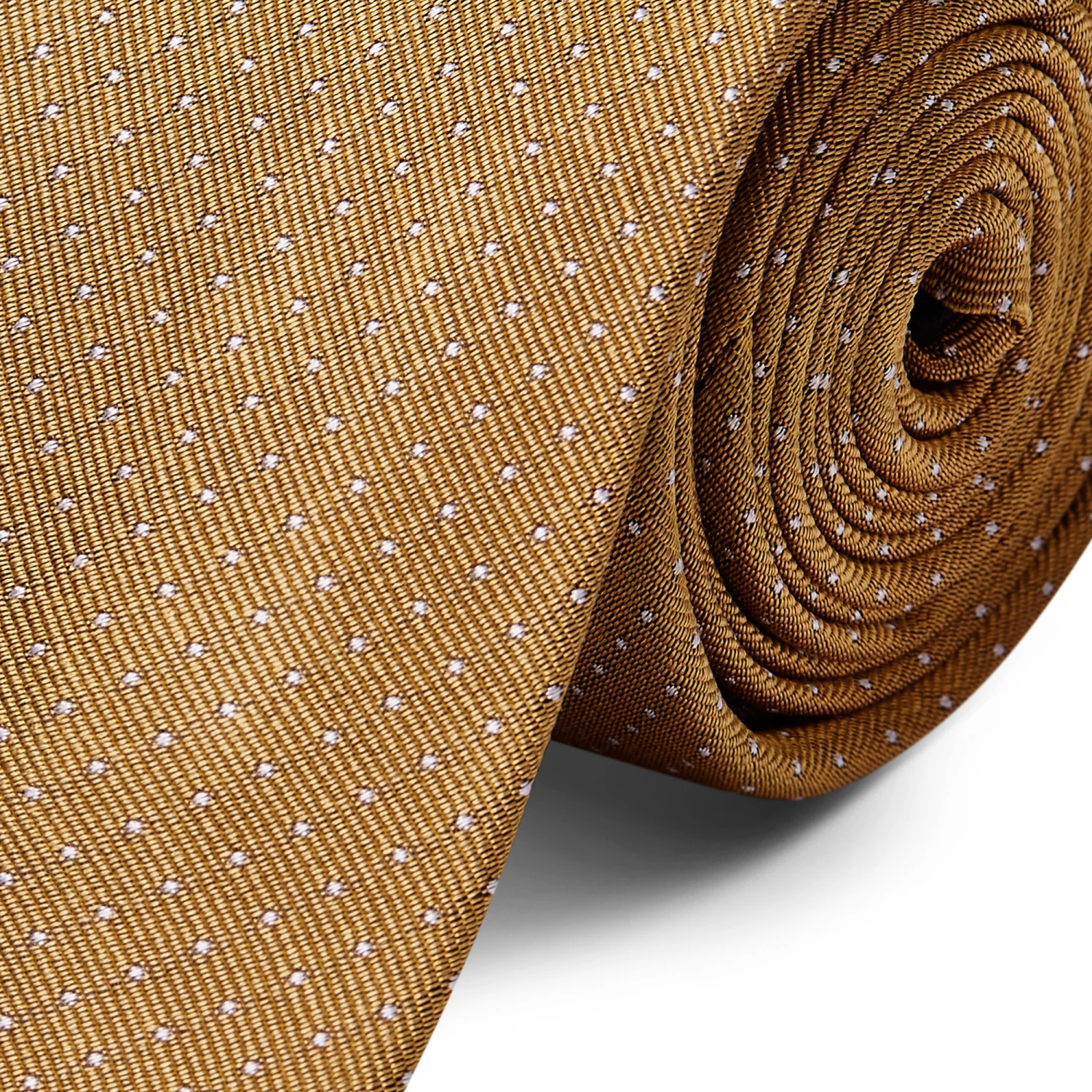 This fine gold necktie features a gently contrasting polka dot pattern for a touch of understated old-school class.