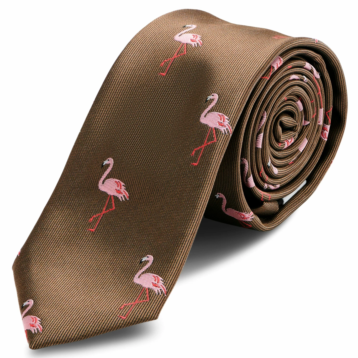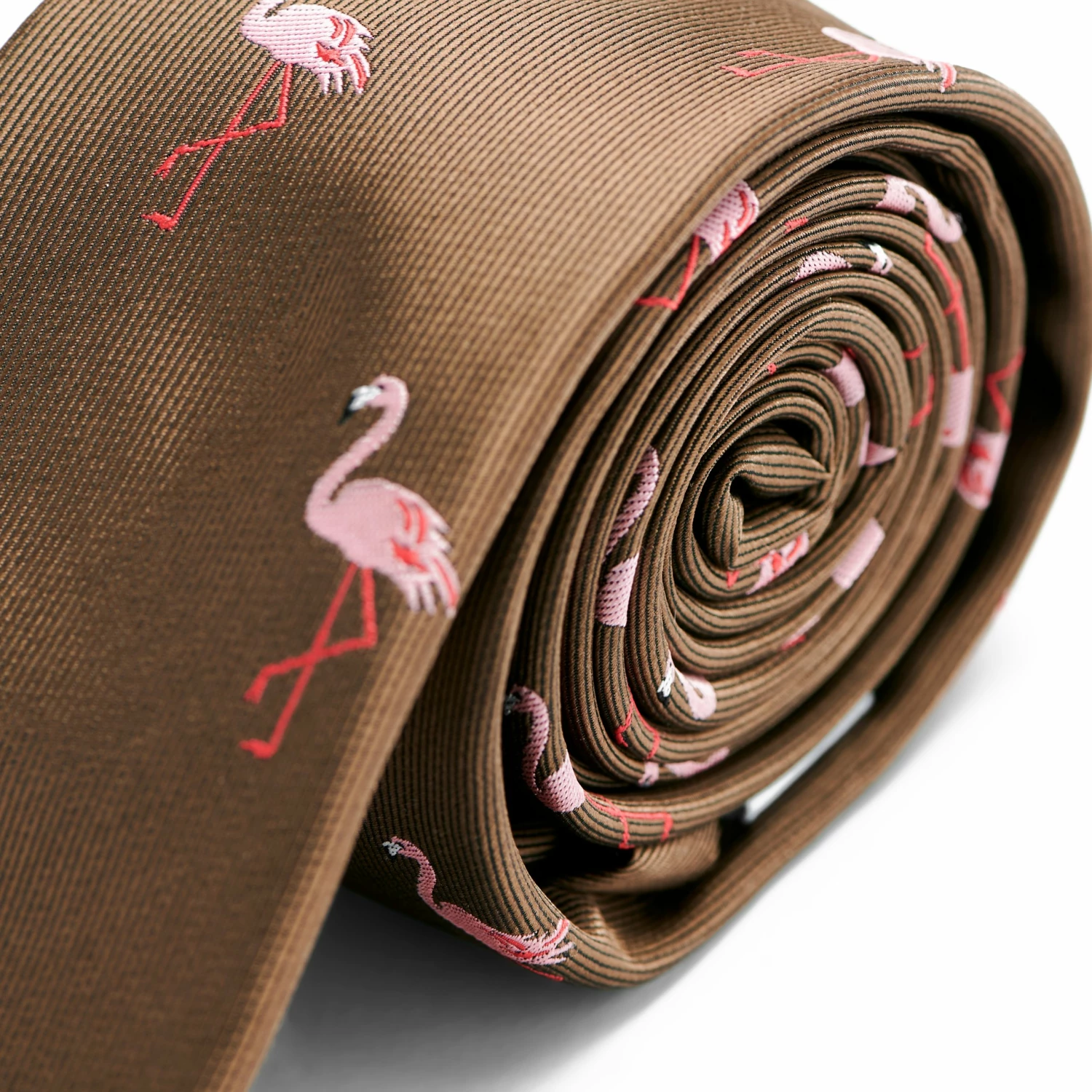 Crafted from durable, soft polyester, this brown skinny tie features enough flamingos to make a trip to the zoo obsolete. And it looks great with your summer suit.