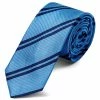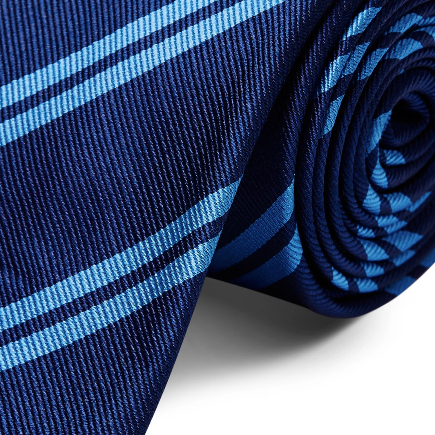 This deep navy necktie features twin light blue stripes for an attractively simple and clean look.