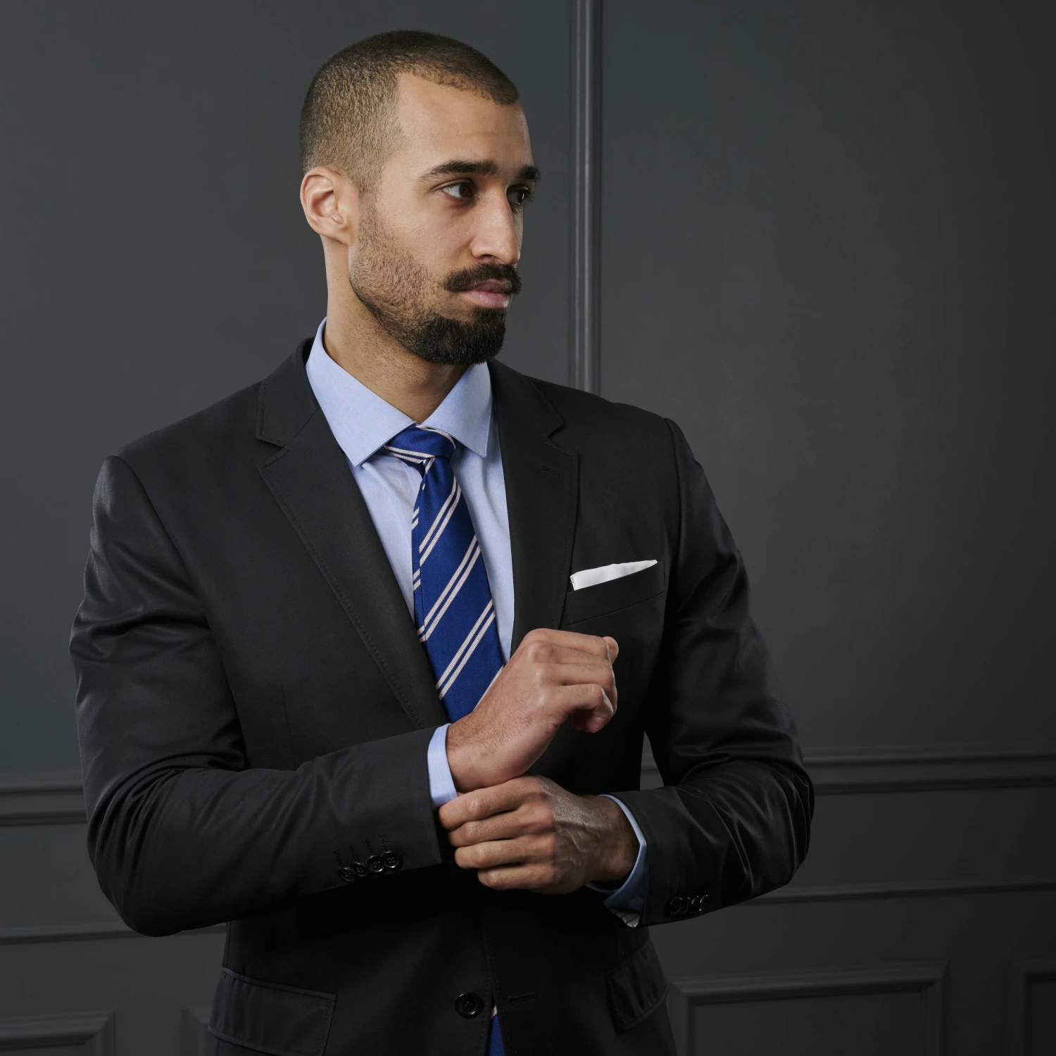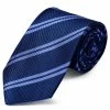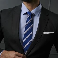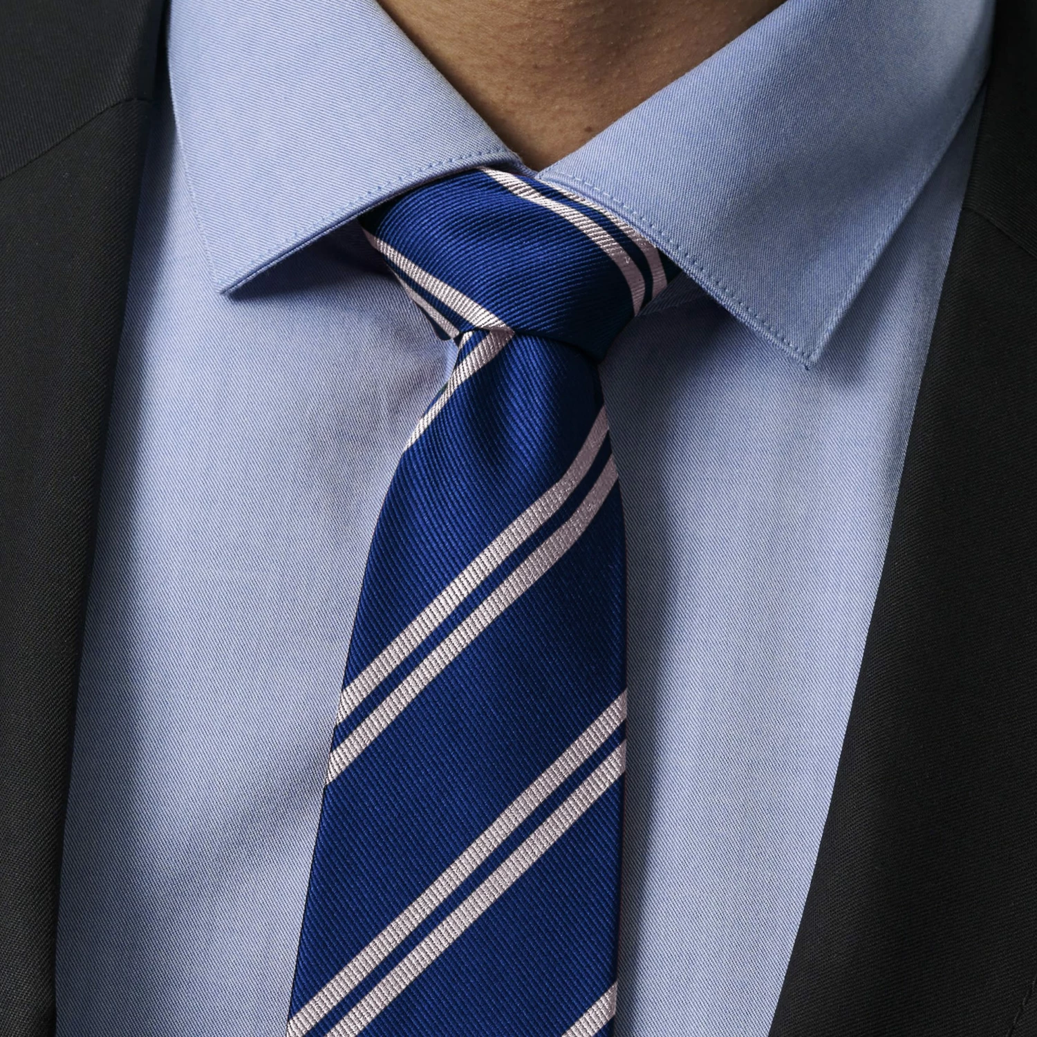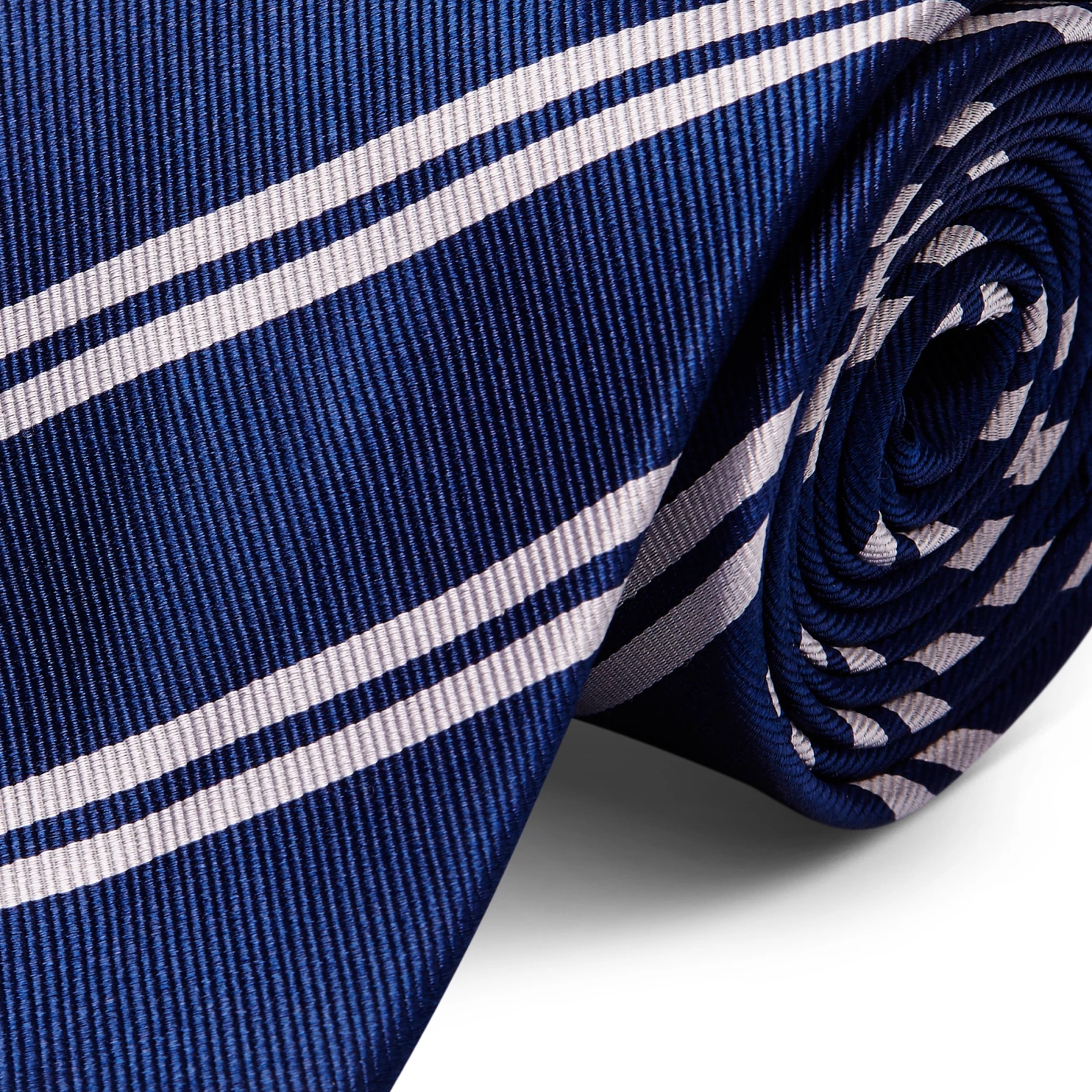 Clean white stripes provide a beautiful contrast to the deep navy background on this fine silk necktie, giving it a simple, elegant appeal.
