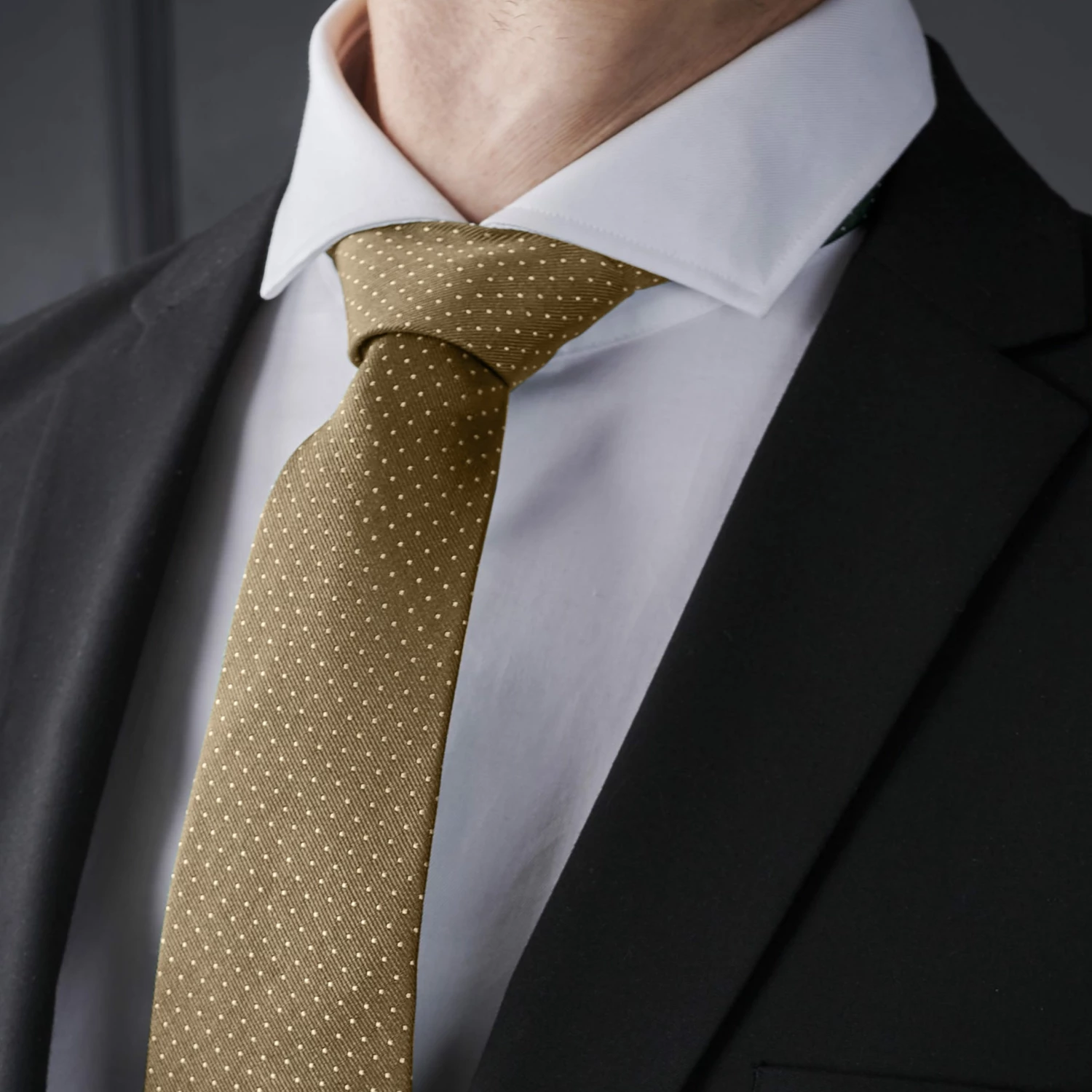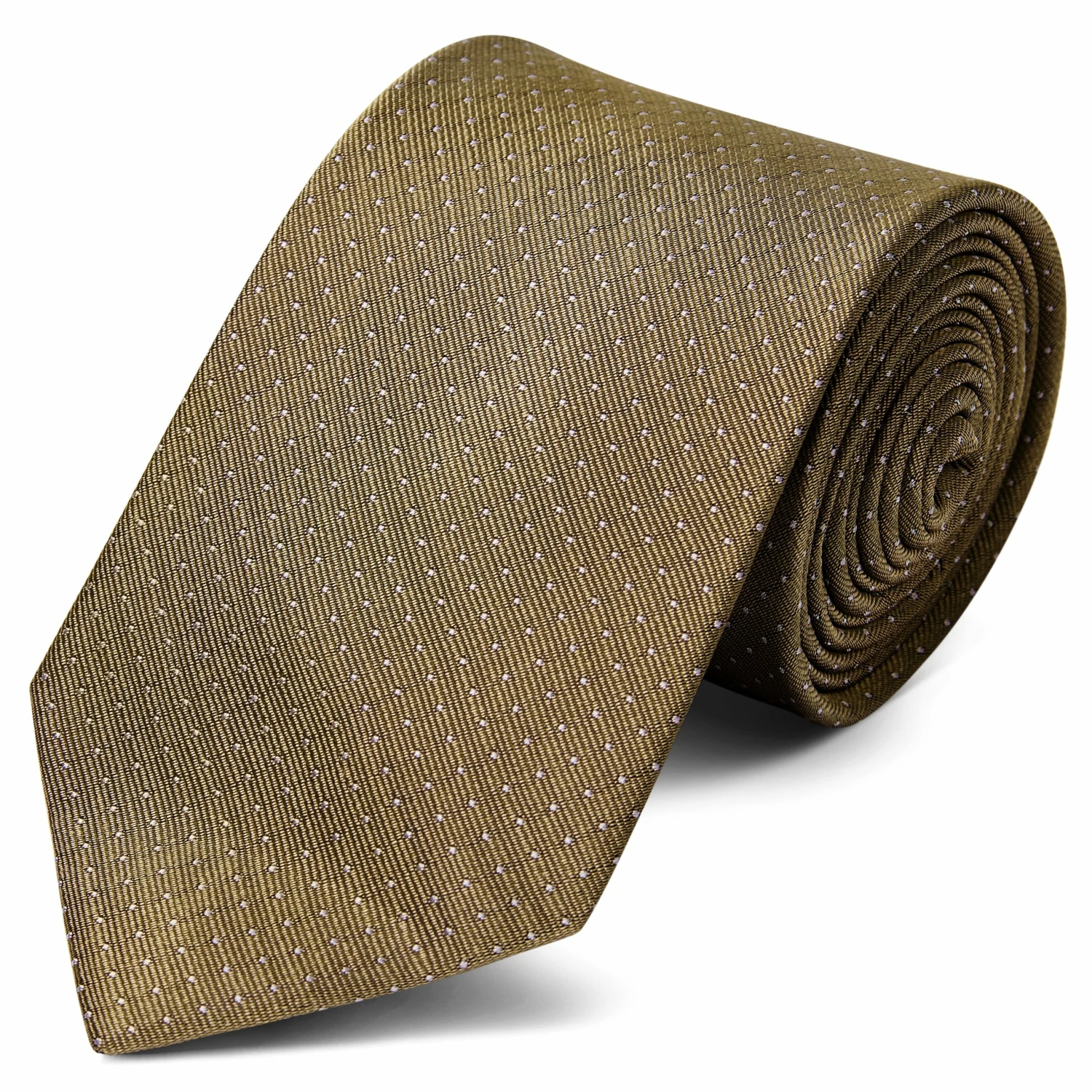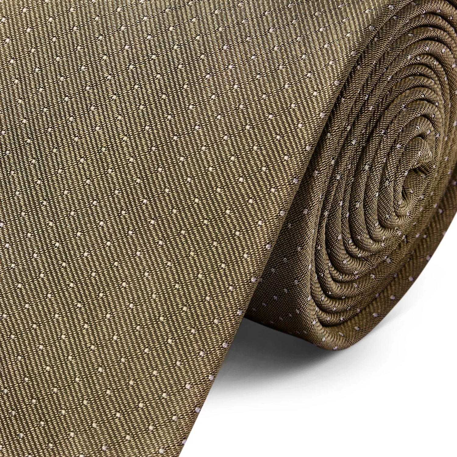 This charming necktie features a subtle polka dot design that gently contrasts against the smooth beige color, giving it a vintage look and feel.