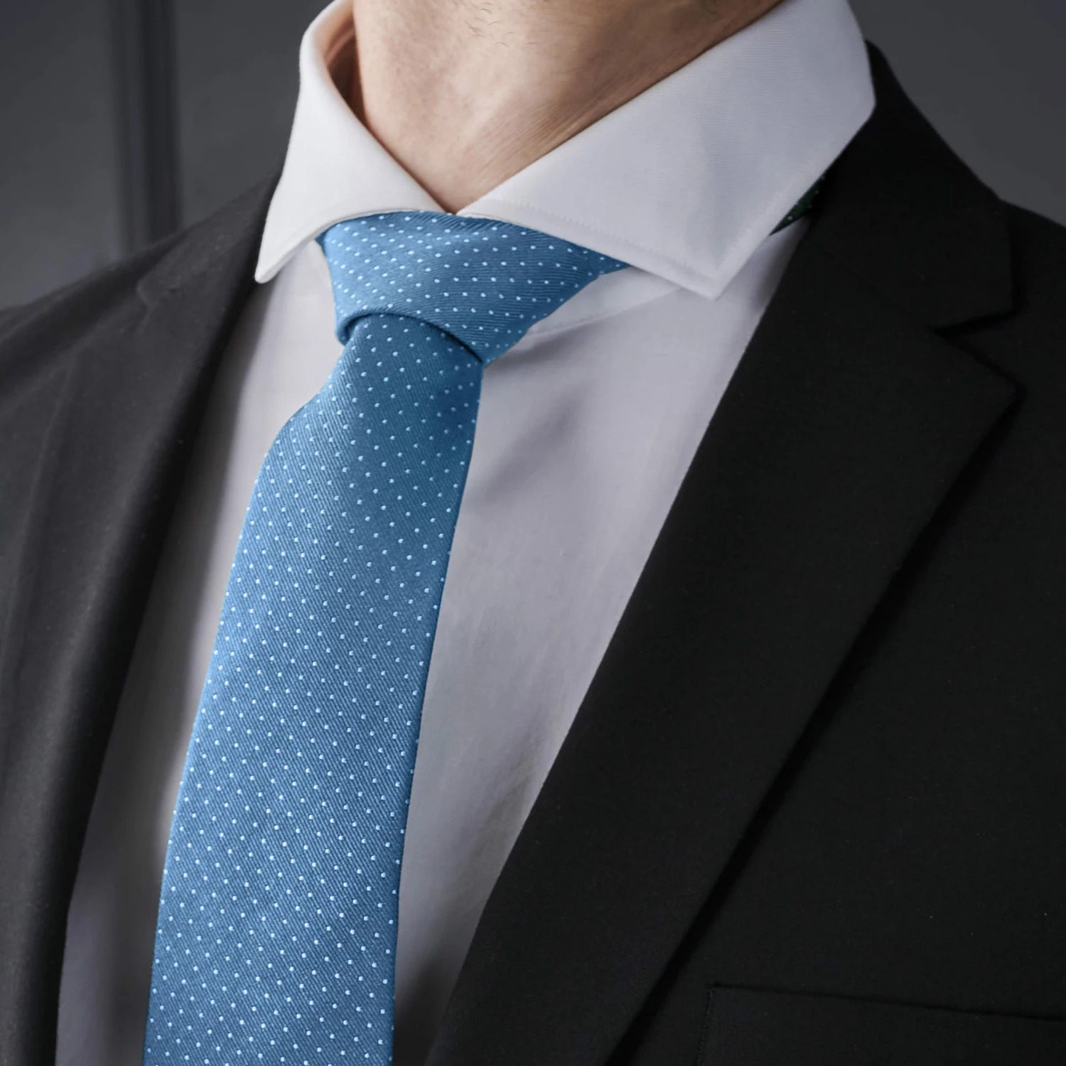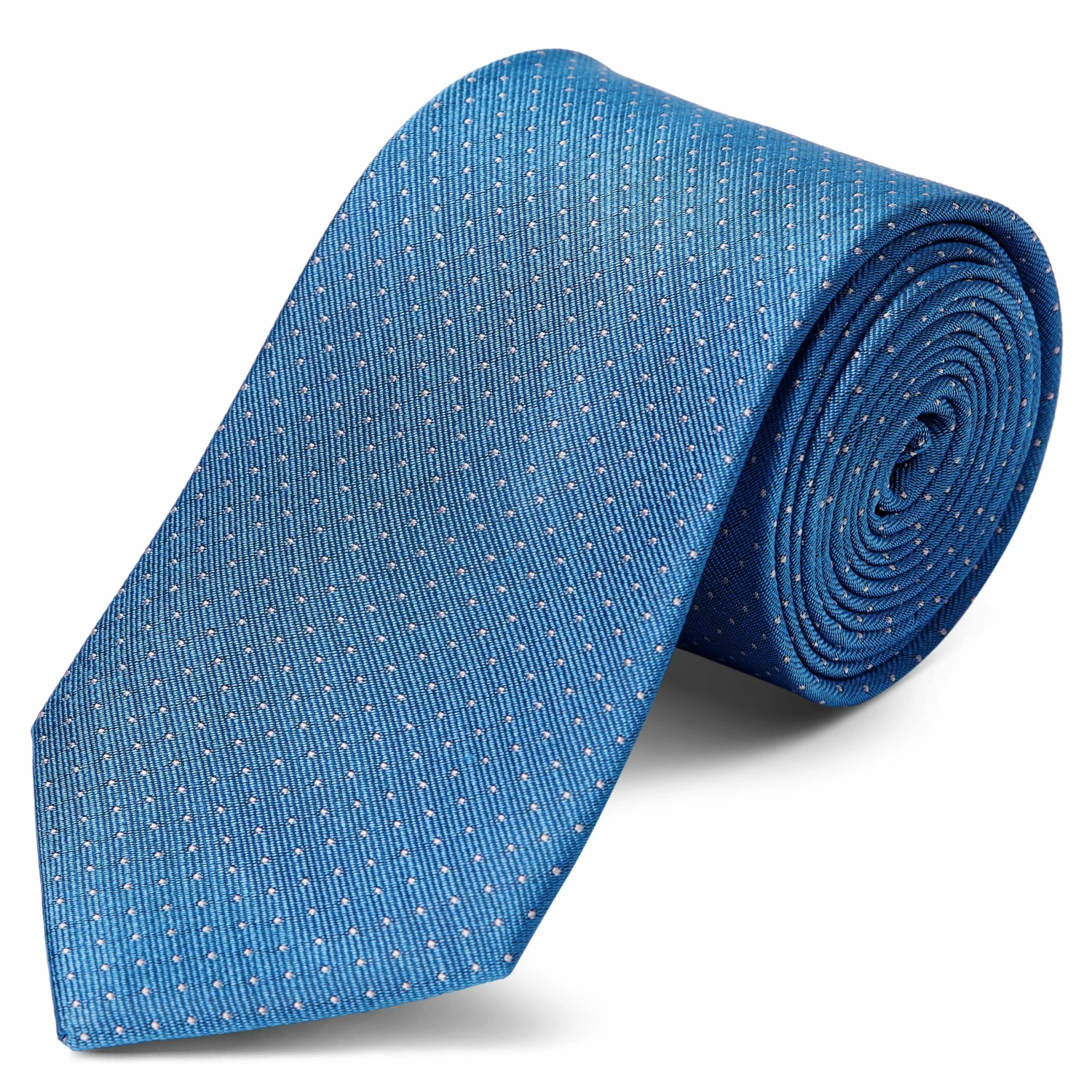 This alluring blue necktie comes in a bright playful color with subtly contrasting polka dots, giving it an understated vintage touch.