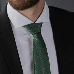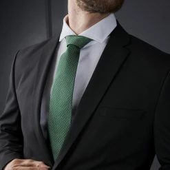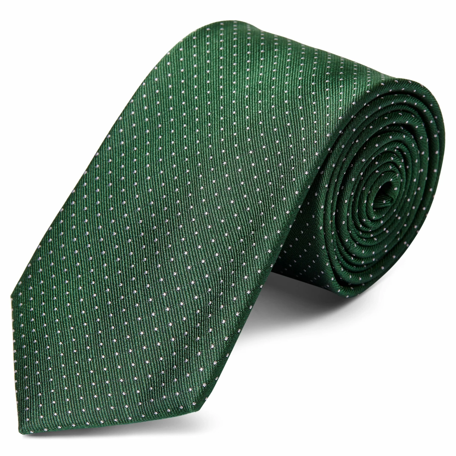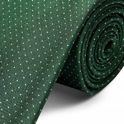 This elegant green necktie features a subtle polka dot pattern for a vintage feel and look.