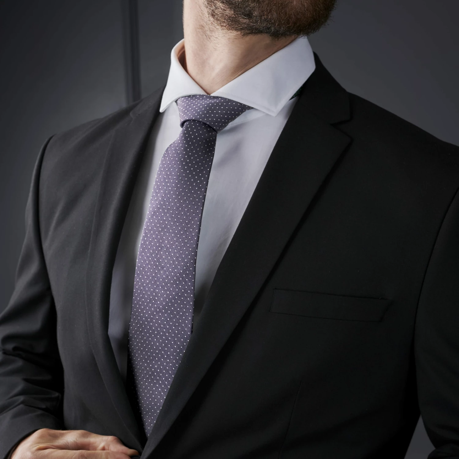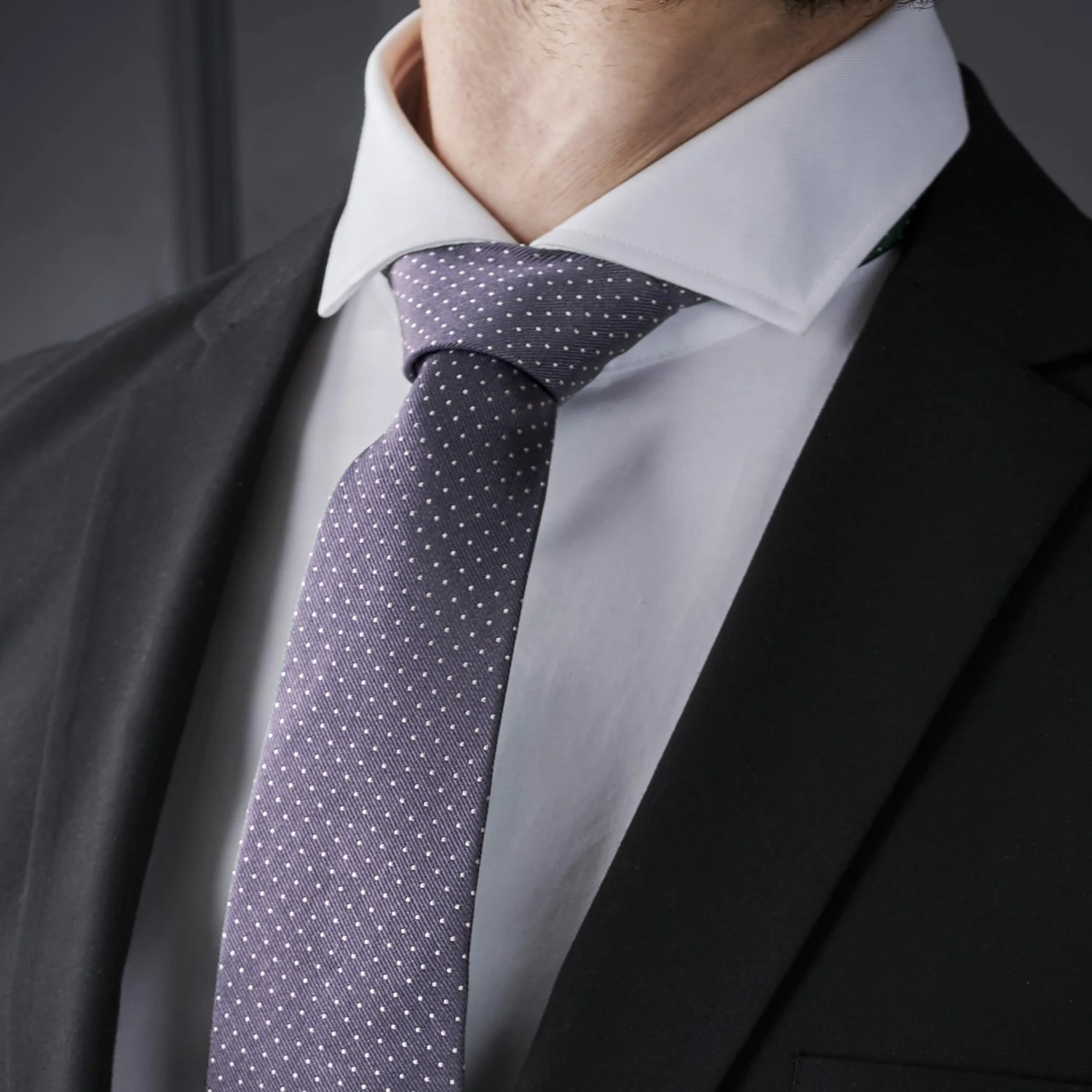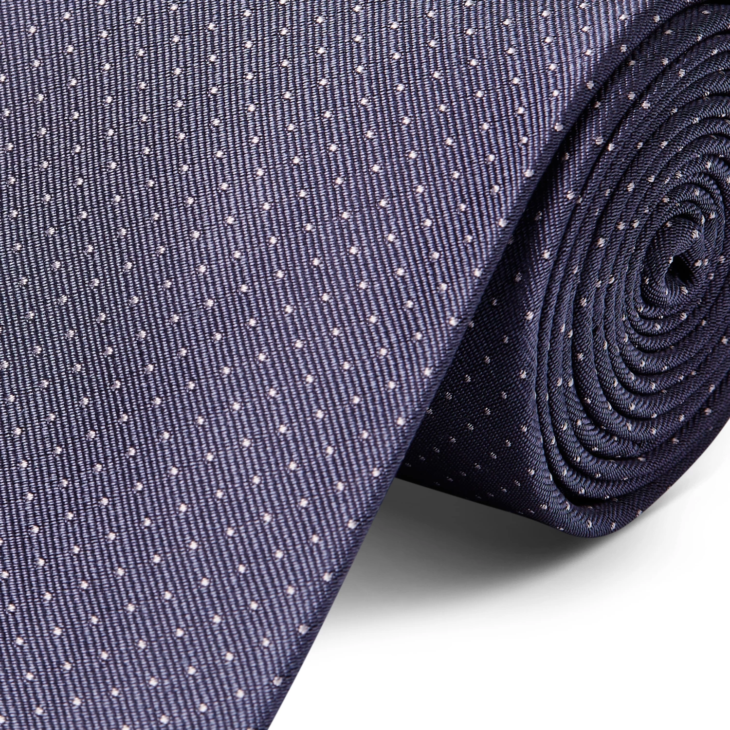 This understated necktie comes in a subtle gray with fine white polka dots for an elegantly refined finish to your outfit.