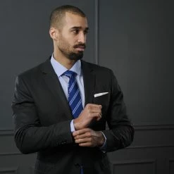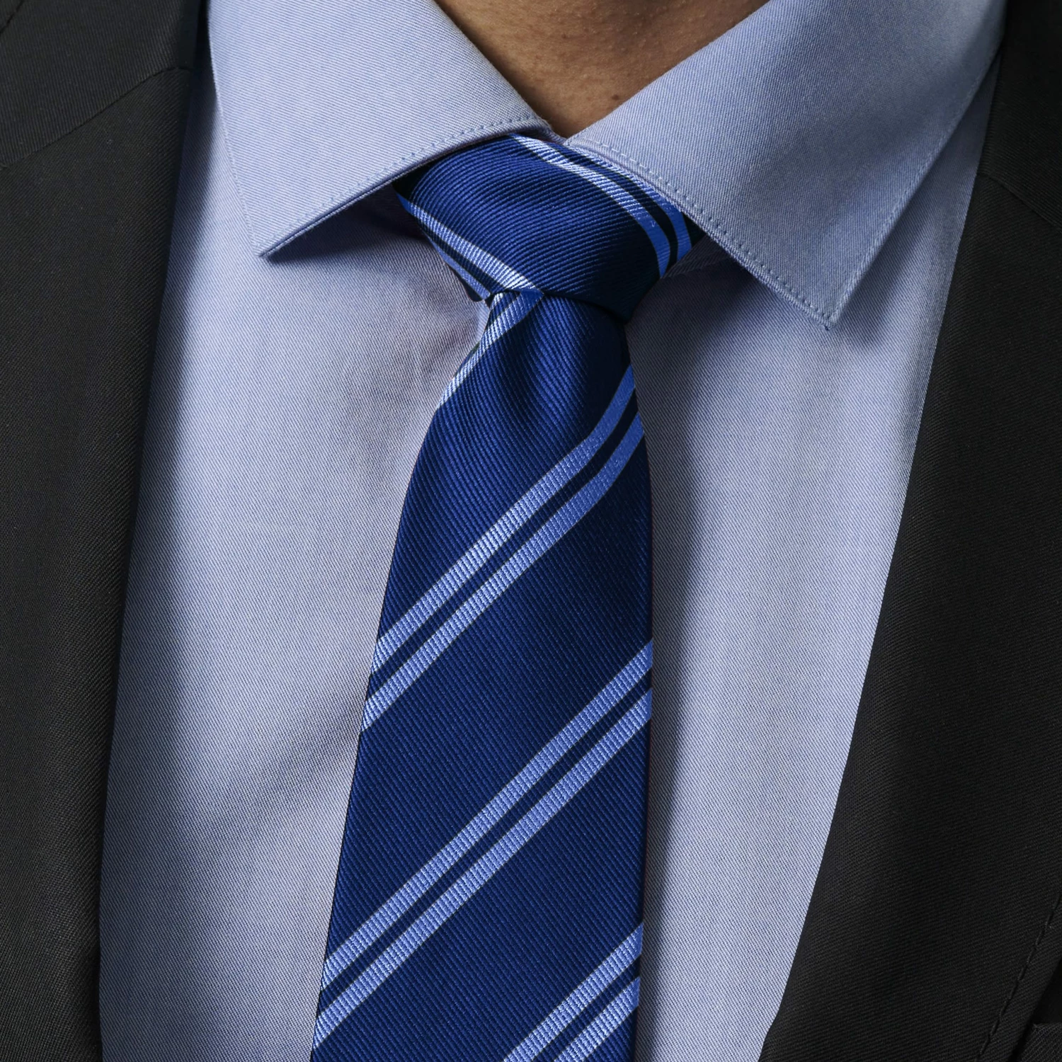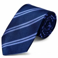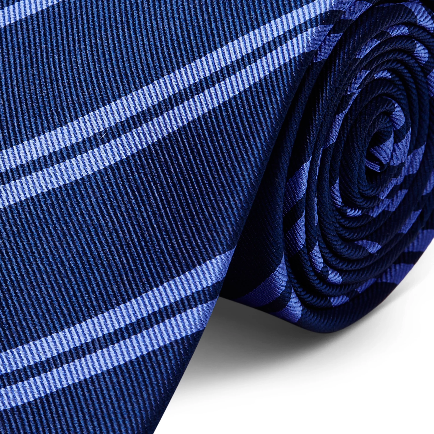 This discreet necktie comes in a classic navy blue, with subtly contrasting thin pastel stripes that give it a refined finish.