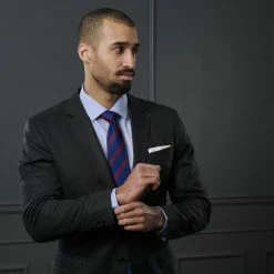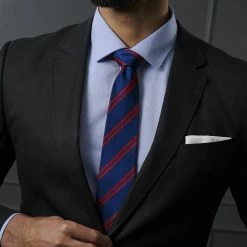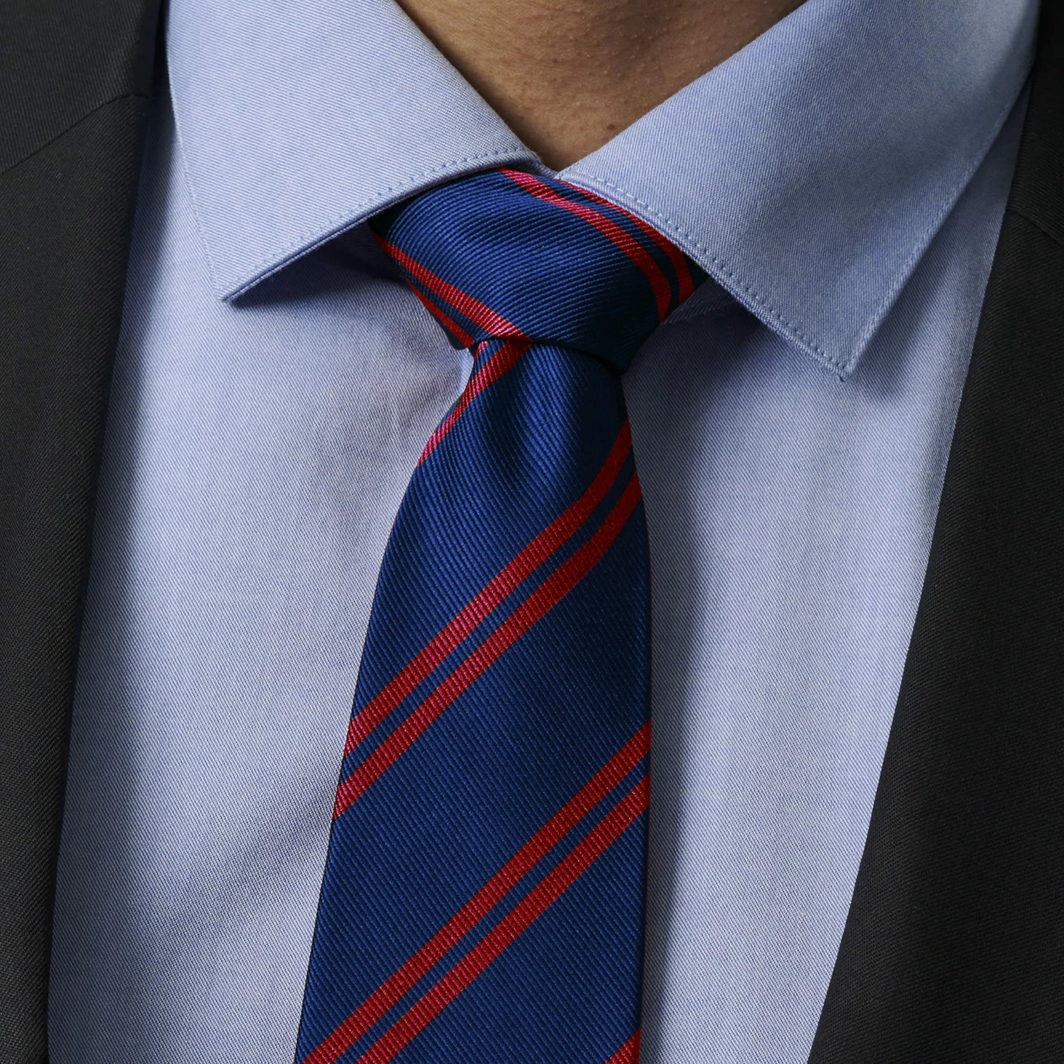 Vibrant red stripes contrast with a deep navy background on this wide, classic necktie.