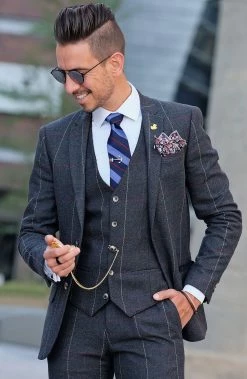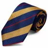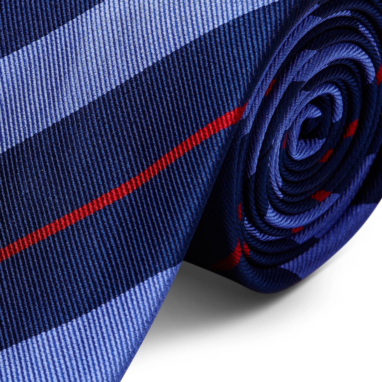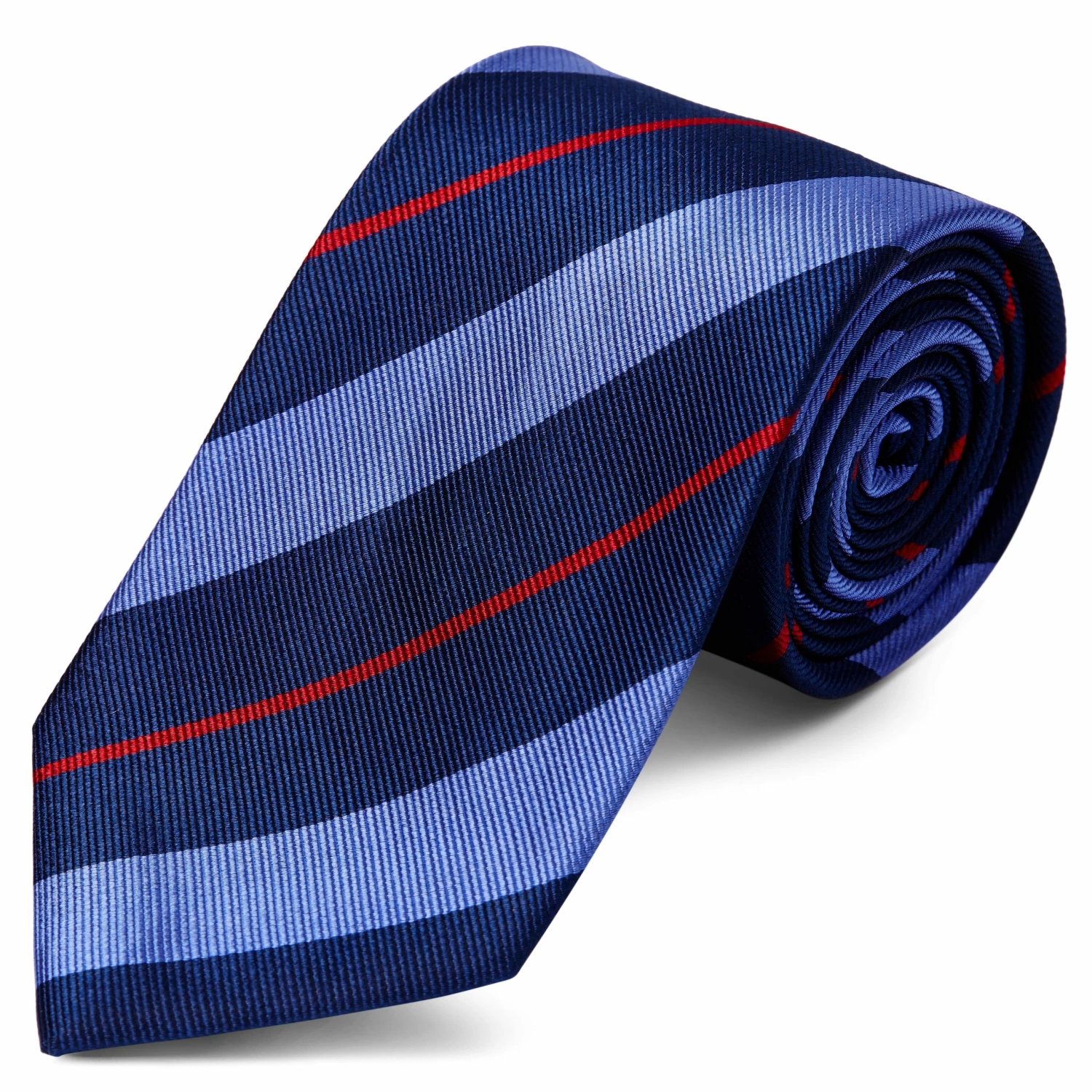 Gentle navy and pastel blue stripes are given a vibrant touch with thin red lines on this handsomely striped necktie.