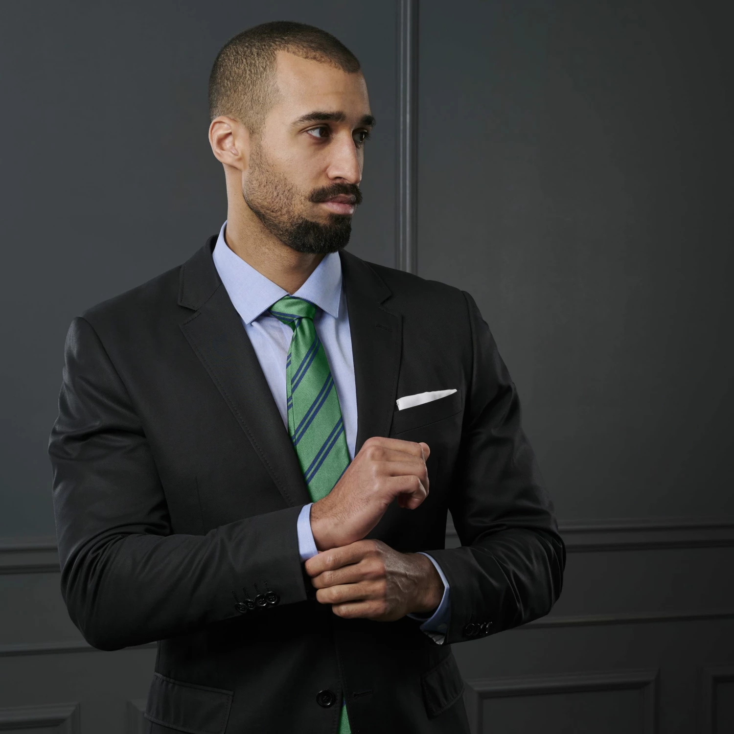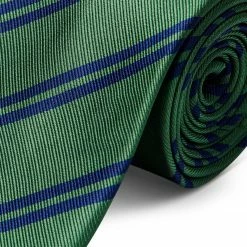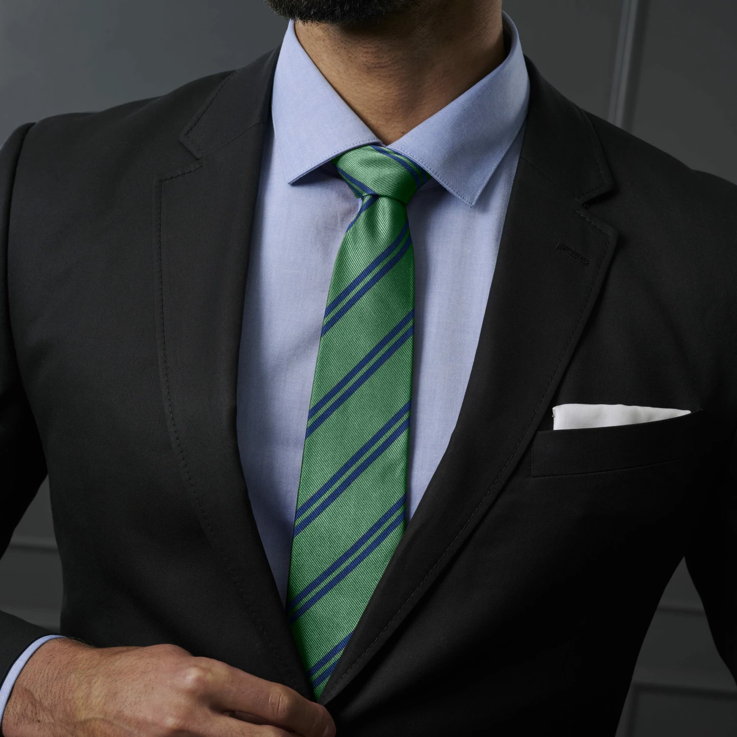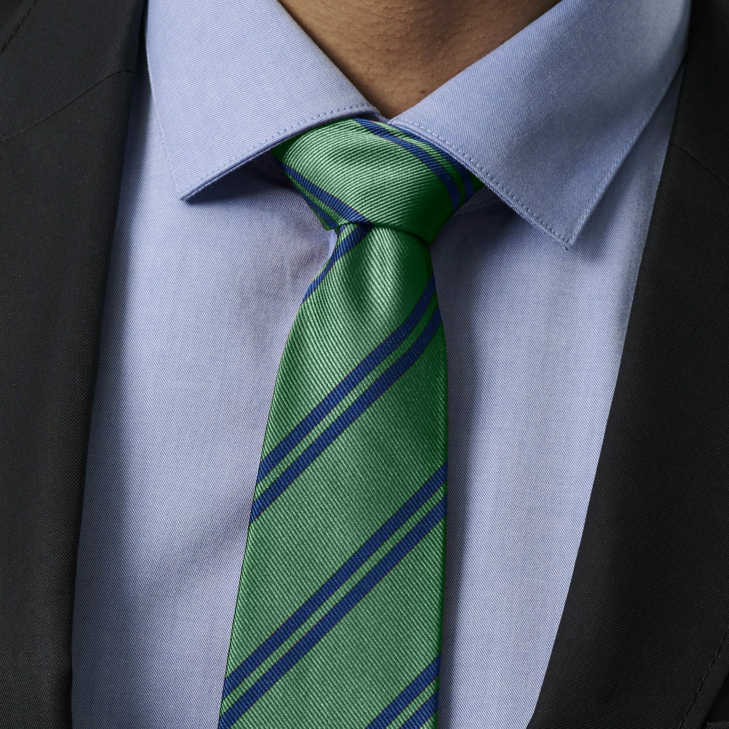 Simple and elegant, this green necktie features twin navy stripes for a charming addition to your outfit.